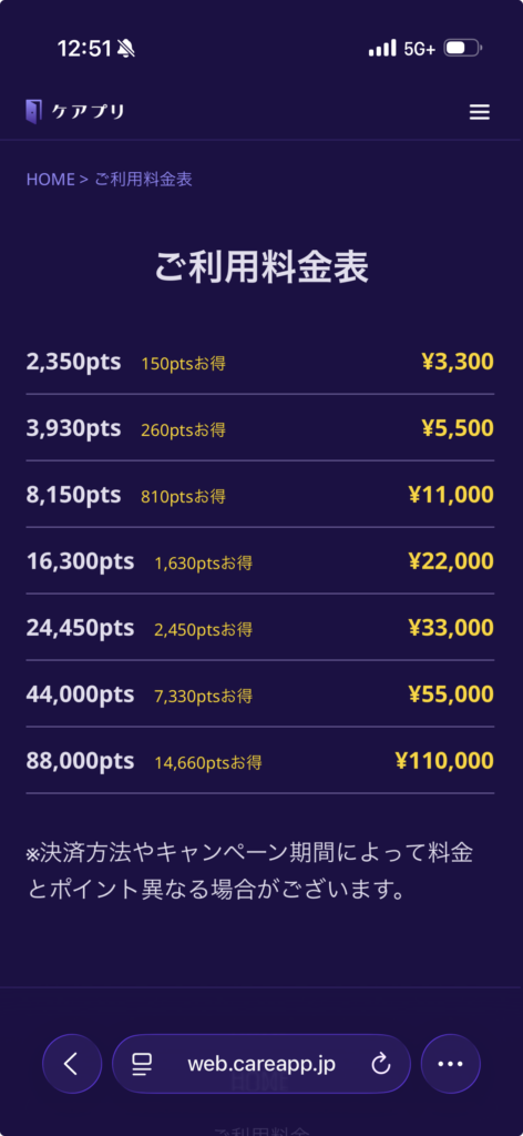 ケアプリの料金体系は、基本的にポイント制です。あらかじめポイントを購入(チャージ)し、それを使って相談を行います。